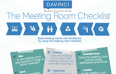 Davinci Meeting and Conference Rooms is proud to present an infographic checklist to finding the perfect meeting room rental. Use this checklist to ensure your client meetings are fully equipped with all the technology, amenities, a...